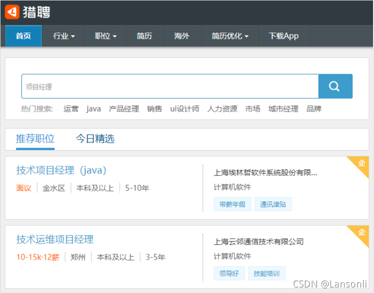 本次案例,要实现一个类似于猎聘网的案例,用户通过搜索相关的职位关键字,就可以搜索到相关的工作岗位。我们已经提前准备好了一些数据,这些数据是通过爬虫爬取的数据,这些数据存储在CSV文本文件中。我们需要基于这些数据建立索引,供用户搜索查询。