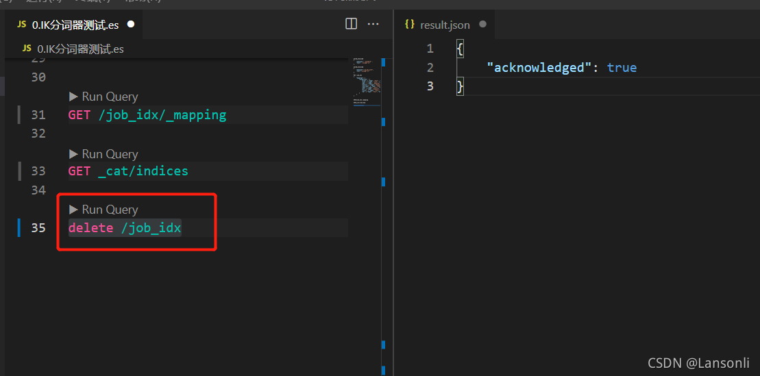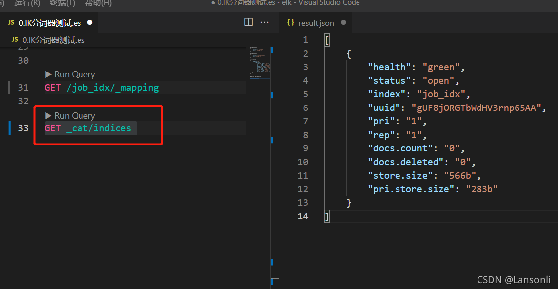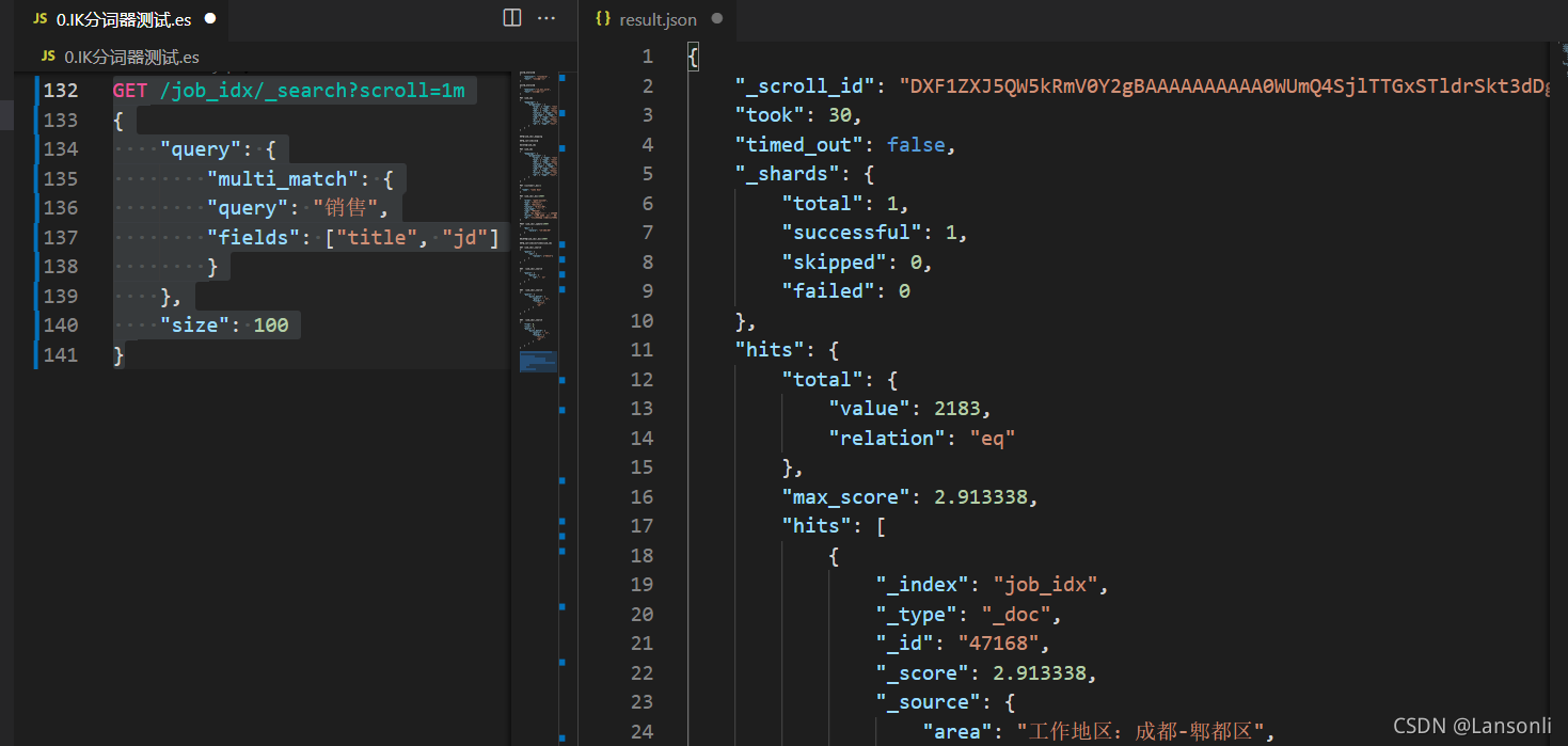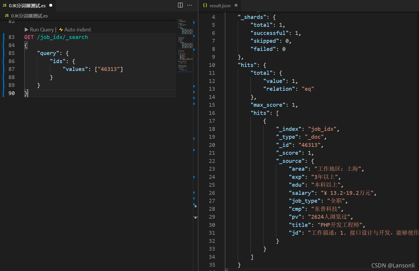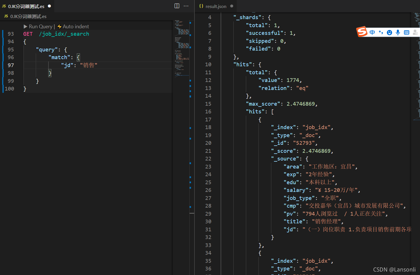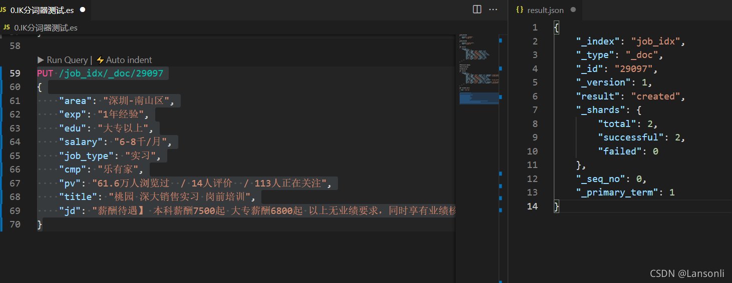 为了方便后面的测试,我们需要先提前导入一些测试数据到ES中。在资料文件夹中有一个job_info.json数据文件。我们可以使用Elasticsearch中自带的bulk接口来进行数据导入。