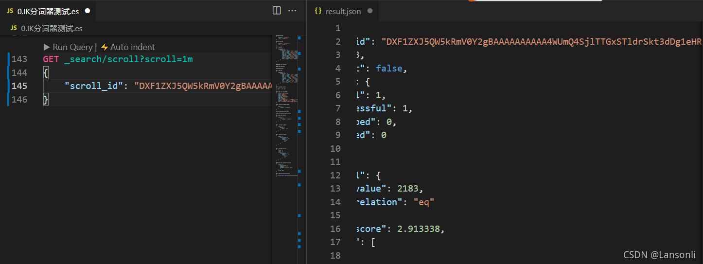 在进行大量分页时,每次分页都需要将要查询的数据进行重新排序,这样非常浪费性能。使用scroll是将要用的数据一次性排序好,然后分批取出。性能要比from + size好得多。使用scroll查询后,排序后的数据会保持一定的时间,后续的分页查询都从该快照取数据即可。