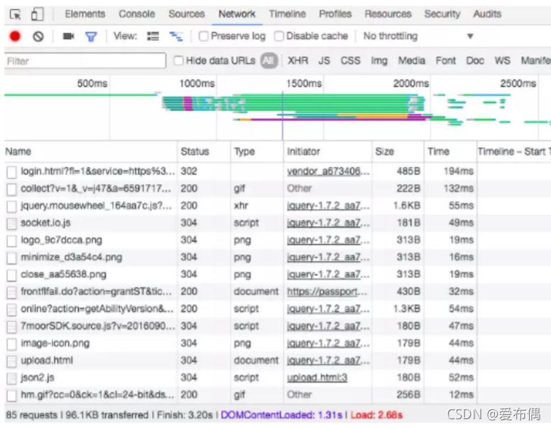Network网络请求标签页:可以看到所有的资源请求,包括网络请求,图片资源,html,css,js文 件等请求