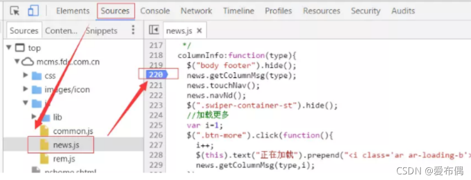 找到要调试的文件,然后在内容源代码左侧的代码标记行处点击 即可打上一个断点