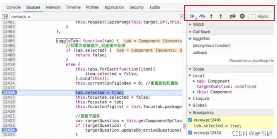 右侧最上面一排分别是:暂停/继续、单步执行(F10快捷键)、单步跳入此执行块 (F11快捷键)、单步跳出此执行块、禁用/启用所有断点。