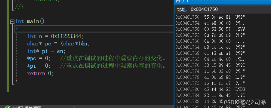 *pc = 0; //重点在调试的过程中观察内存的变化。