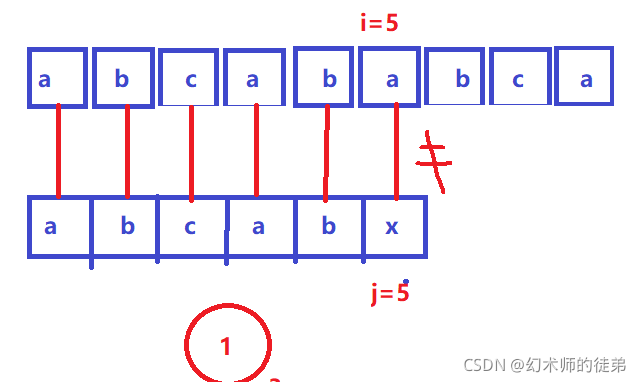 根据图中的理解,我们寻找回溯位置是遵照了这样一个准则,找一个位置以sub[0]开头的串1,他的结尾字符是sub[j-1](位置不确定),如果再能找到一个结尾位置是sub[j-1]的串2,并且其开头字符是sub[0](位置不确定 下标记为x) 且要求这俩串相等的。