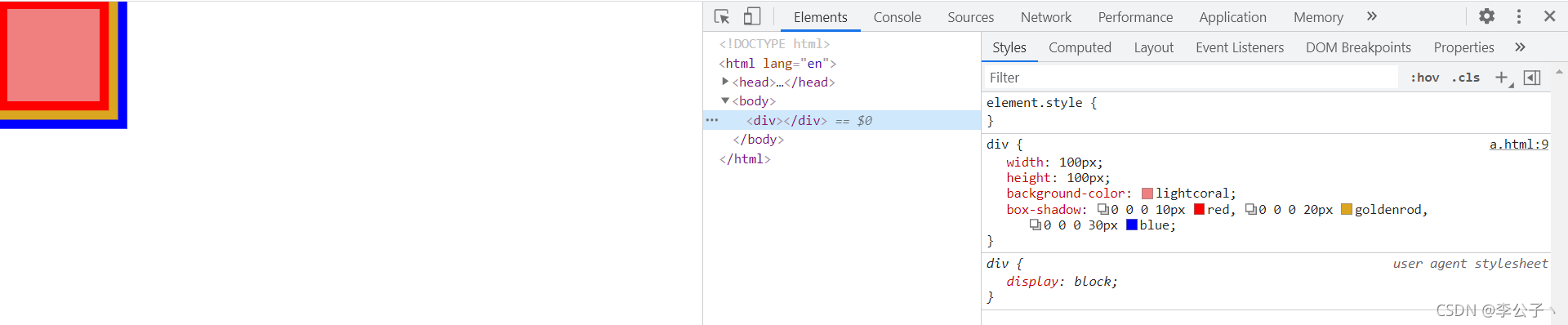 div{ width: 100px; height: 100px; background-color: lightcoral; box-shadow: 0 0 0 10px red, 0 0 0 20px goldenrod, 0 0 0 30px blue; }