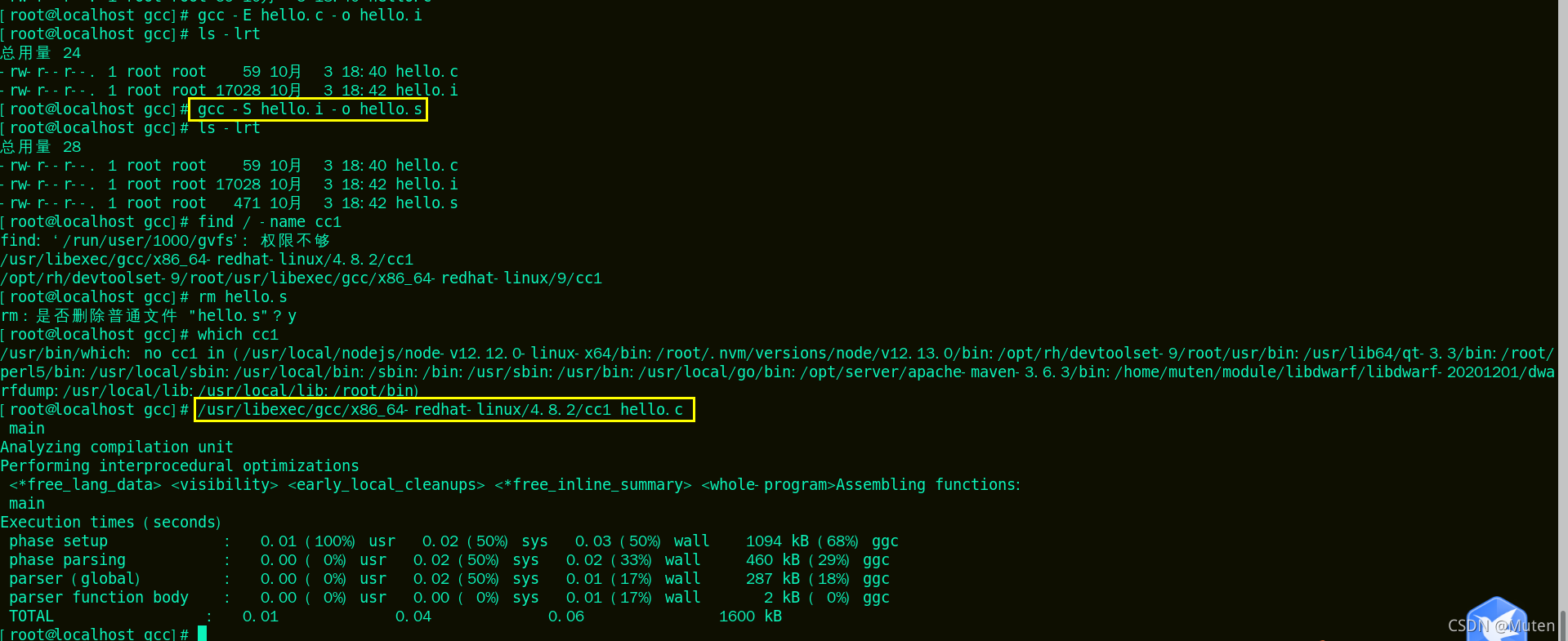 直接调用cc1来完成它,都可以得到汇编输出文件 hello.s。