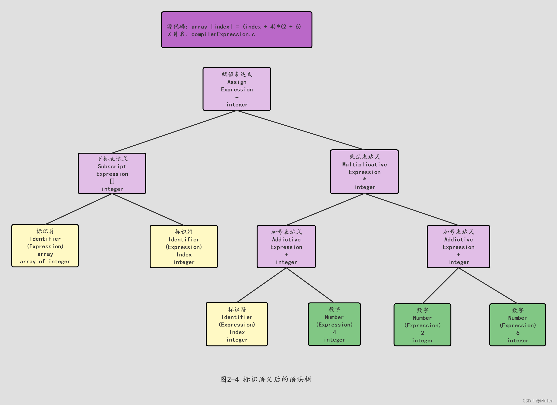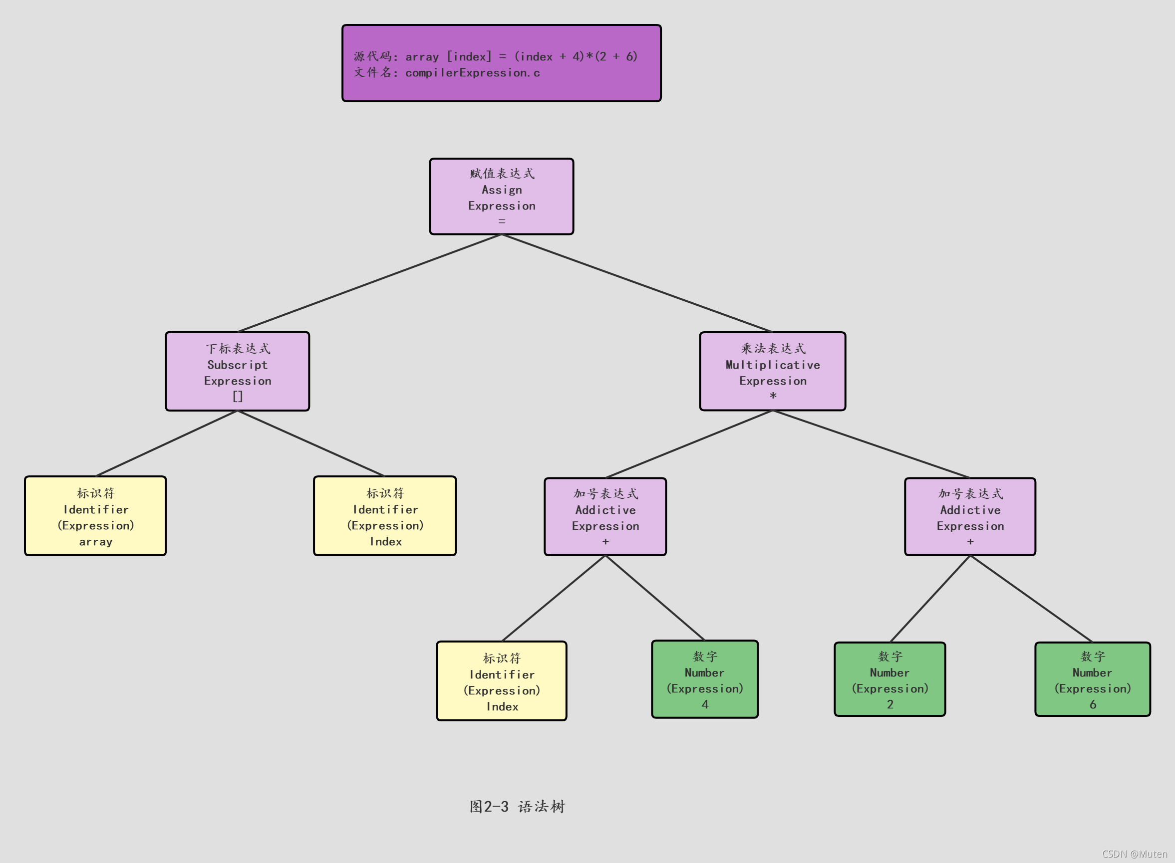 数组表达式,它的右边是一个乘法表达式;数组表达式又由两个符号表达式组成,等等。