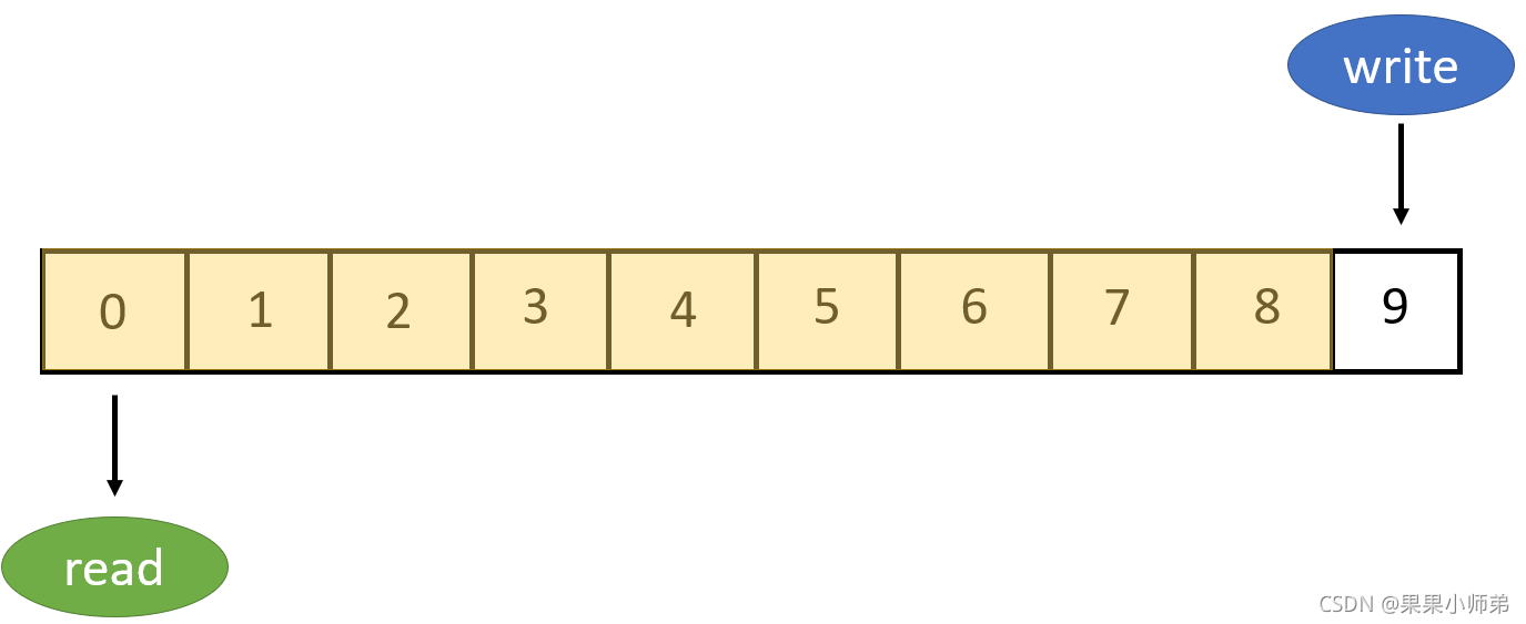 在这里可以看到队列中加入了 9个数据,并且每加入一个数据后队尾索引加 1,队头不变,这就是数据加入队列的过程。但是缓存空间只有10个,如何判断队列已满呢?如果只是先一次性加数据到队列中,然后再读出数据,那这里的判断条件显然是队尾索引为 9。