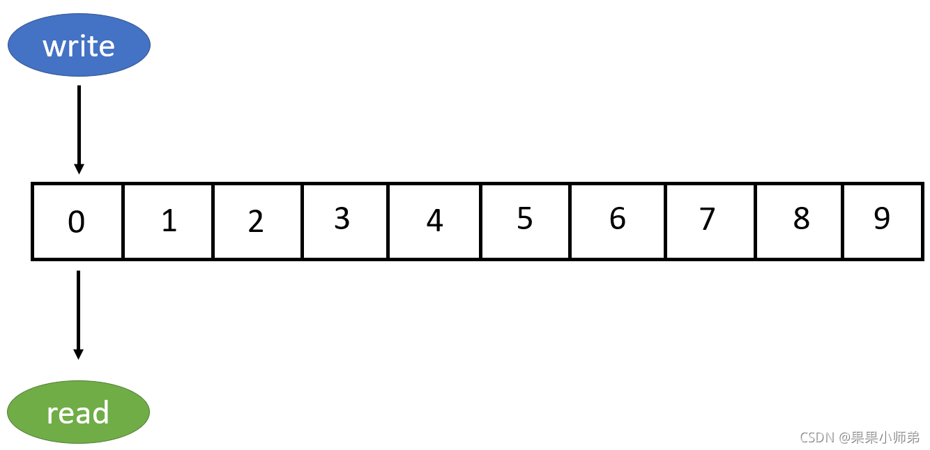缓存一开始没有数据,并且用一个变量write指示下一个写入缓存的索引地址,这里下一个存放的位置就是 0,用另一个变量read 指示下一个读出缓存的索引地址,并且下一个读出数据的索引地址也是 0。目前队列中是没有数据的,也就是不能读出数据,队列为空的判断条件在这里就是两个索引值相同。