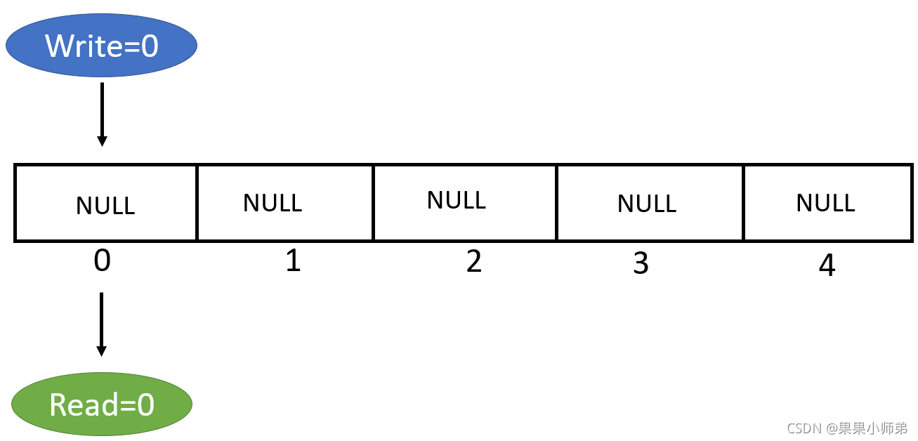 我们这里以5个字节的FIFO空间进行说明。Write变量表示写位置,Read 变量表示读位置。初始状态时,Read = Write = 0。