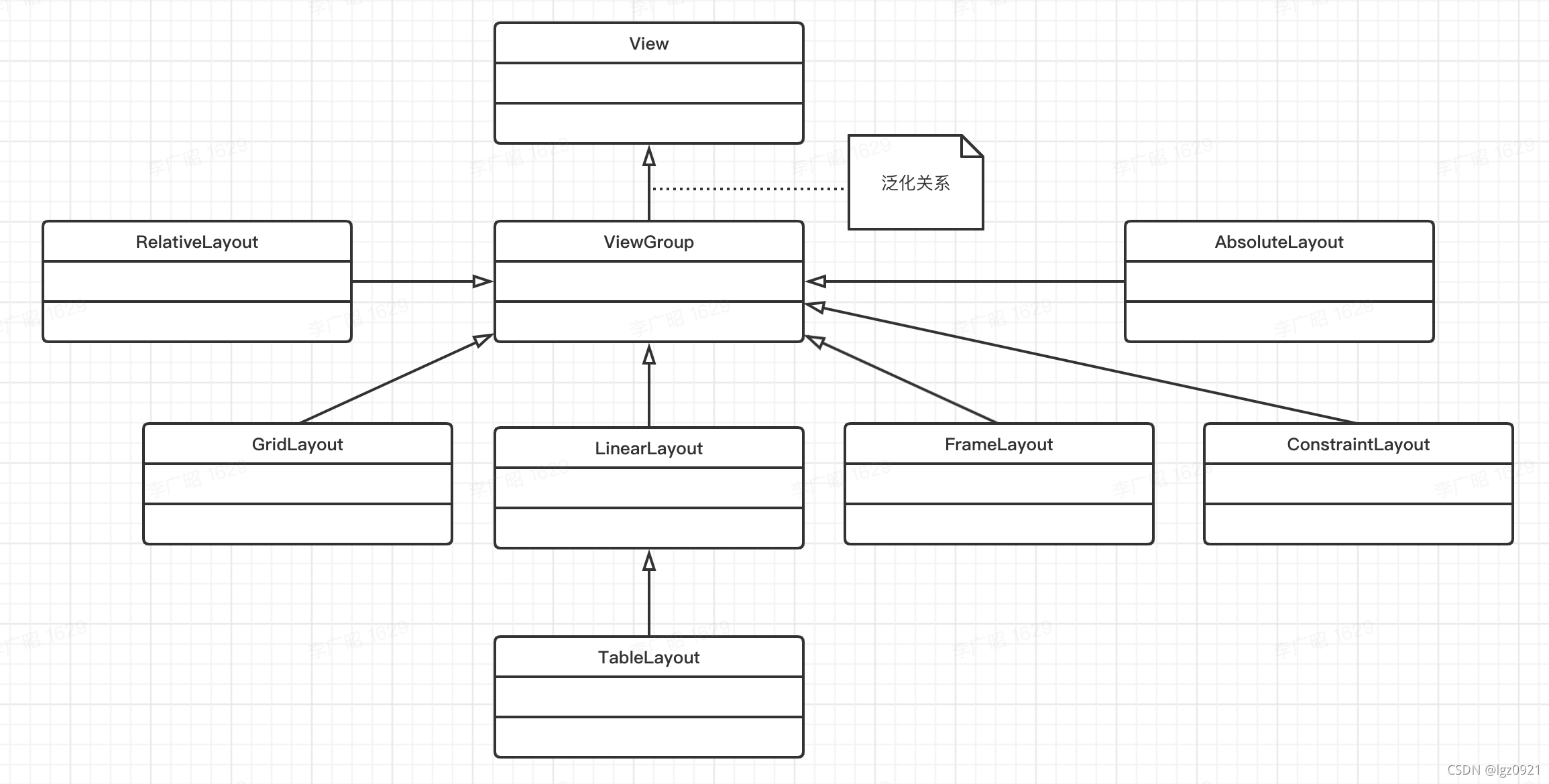 上面这个类图只是说了六大基本布局的关系,当然ViewGroup还有其他一些布局管理器。