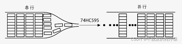 74HC595实现了串行输入转并行输出的功能。先说下什么是串行与并行。下图可以简单看出串行与并行的区别。串行是一个一个数往发,而并行是8位数一道往外发的。