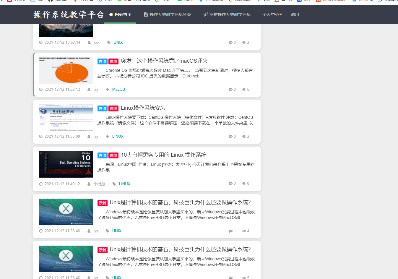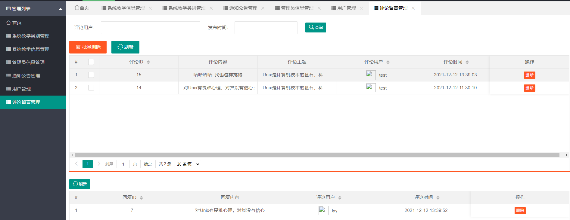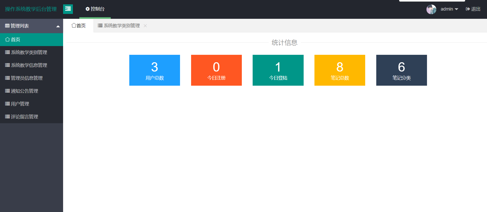 管理员: 登录和注册用户统计、分类文章统计、教学分类管理、文章信息分类管理、评论管理、回复管理、用户管理、个人信息管理、退出等。