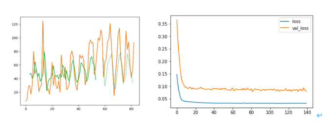 在数据集上的实验结果如下图所示,左图展现了LSTM模型在数据集上的拟合情况,横轴为时间,纵轴为事件单数,黄色线为真实值,绿色实现代表训练集上的预测结果,绿色虚线表示测试集上的结果。可以看到模型基本可以拟合出变化趋势,但是在具体的数量预测还有改进的空间。右图展现了在验证集和测试集上的loss趋势图。