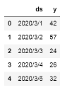 首先对对提取到的数据进行预处理,提取出时间(ds)和事件单数(y)两列数据,部分数据可视化结果如下图所示: