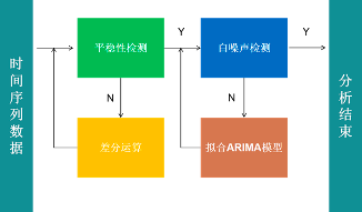 首先对时间序列数据进行平稳性检测,若不通过,则采取对数、差分等相应的变换将其变为平稳序列。通过平稳性检测之后,进行白噪声检测,当序列不是白噪声序列时,即可选择合适的ARIMA模型进行拟合。如果误差值通过白噪声检测,就可以采用拟合出的模型对时序数据进行预测了。