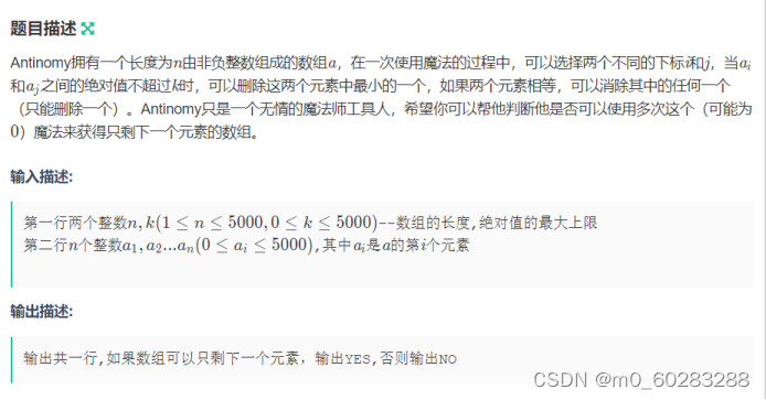 由于对选择的下标没有要求,为了便于筛选,我们可以通过排序获得一个升序的整齐序列。(这样可以使得任意两个数值相近的数在空间上靠在一起)我们利用贪心的思想,遍历数组,如果前一个数减去后一个数的差值大于k,那么,输出NO并跳出循环,最后如果都满足便输出YES。