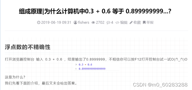 具体解释可以参考:组成原理|为什么计算机中0.3 + 0.6 等于 0.899999999...? - fishers - 博客园