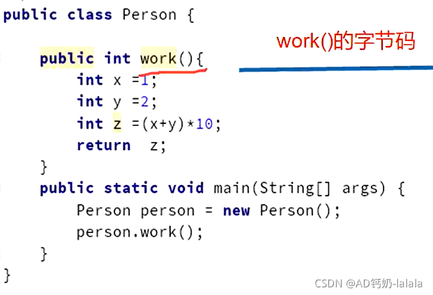 首先main方法入栈,后面会调用work方法,work入栈。iconst_1意味着将int类型的1入操作数栈,istore_1意思是将操作数栈中的1存入局部变量表,这两步就完成了int x = 1这一行代码操作。iconst_2和istore_2同理完成int y = 2操作。iload_1再次将局部变量表下标为1的int类型数据入操作数栈,iload_2将局部变量表下标为2的int类型数据入操作数栈。然后再出栈进行iadd相加操作,再入栈,再存入局部变量表。iload_3代表将局部变量表中下标为3的变量入操作数栈。return操作再把操作数栈的地址返回。