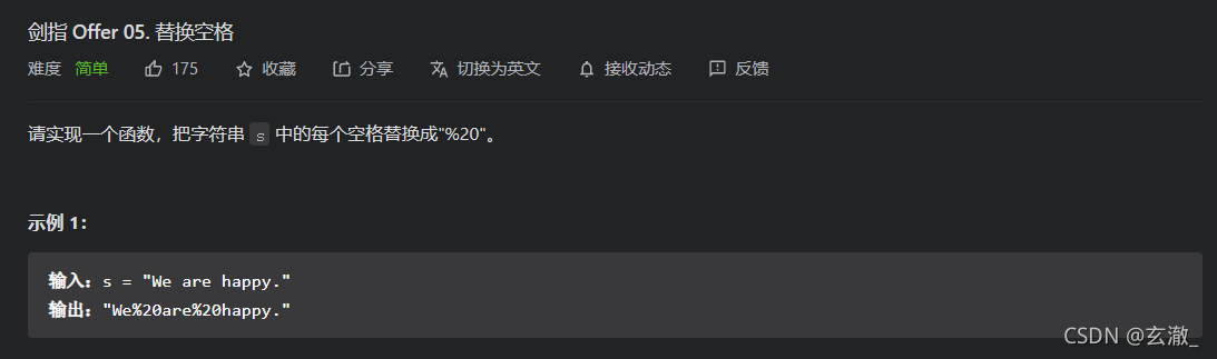 char* replaceSpace(char* s){ char* ret = (char*)malloc(300001 * sizeof(char)); int returnSize = 0; int i = 0; for(i = 0;s[i];i++) { if(s[i] == ' ') { ret[returnSize ++] = '%%'; ret[returnSize ++] = '2'; ret[returnSize ++] = '0'; } else ret[returnSize ++] = s[i]; } ret[ returnSize] ='\0'; return ret; }