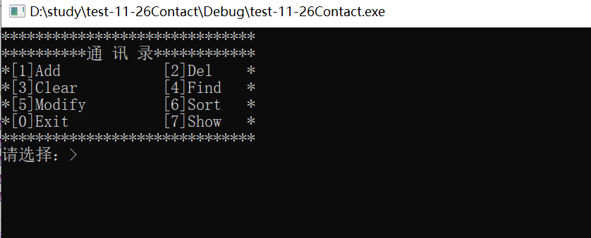 接下来对本次实现的通讯录进行一个简单的介绍,通讯录中个人信息包括姓名、性别、年龄、电话、住址。通讯录共有七个功能,添加、删除、清除、查找、修改、排序、显示,本程序都是通过姓名来实现查找、排序等功能,当然我们也可以通过年龄、性别等实现。通讯录目录如下(输入相应的数字执行对应的功能):