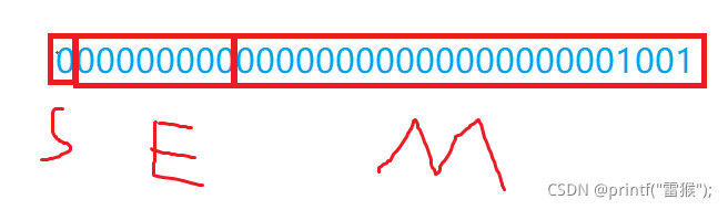 再来看第三个打印结果,9.0转换为二进制是1001.0,(-1)^0*1.001*2^3,存储的时候S就是0,E就是3+127=30,M就是1.001,因此二进制序列为0 10000010 001 0000 0000 0000 0000 0000