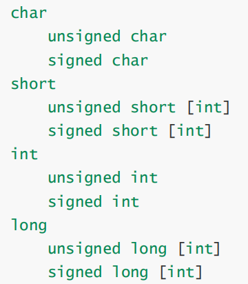 一般编译器下,我们写的char short int long 默认为signed char short int long,也就是带符号的整型