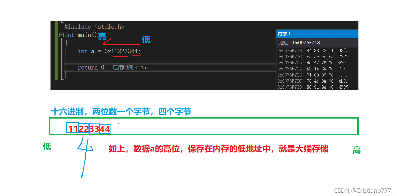 大端(存储)模式,是指数据的低位保存在内存的高地址中,而数据的高位,保存在内存的低地址