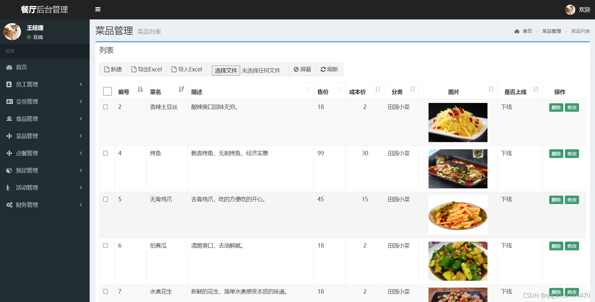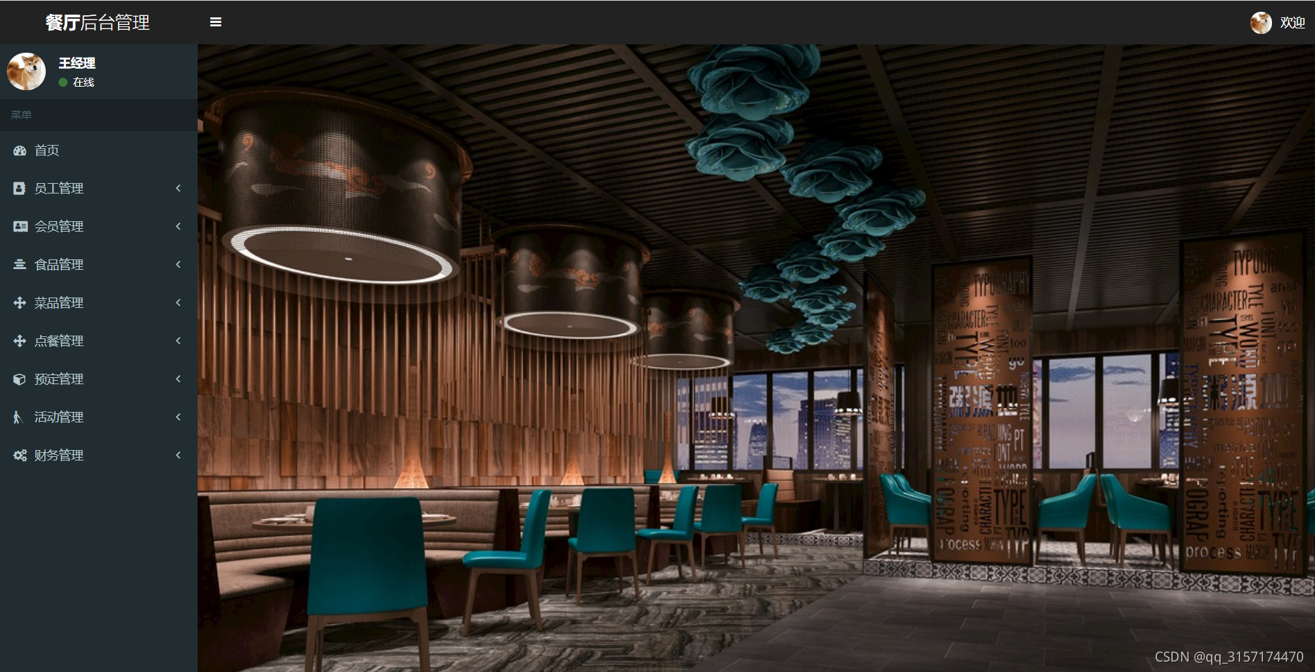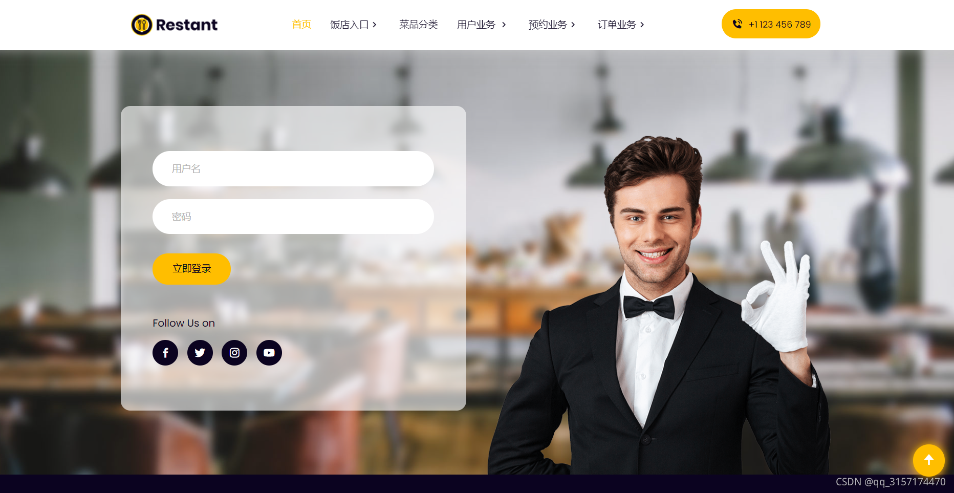前端:登录注册首页饭店入口菜品分类用户业务预约业务订单业务后端:首页员工管理会员管理食品管理菜品管理点餐管理预定管理活动管理财务管理