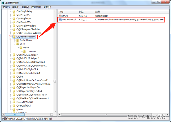 1)在HKEY_CLASSES_ROOT下创建QQGameProtocol节点