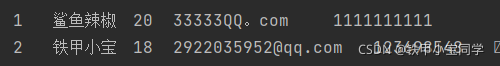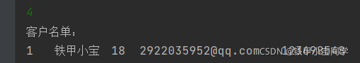 System.out.println(i+1+"\t"+cust.getName()+"\t"+cust.getAge()+"\t"+cust.getEmail()+"\t"+cust.getPhone()+"\t"+cust.getGrade());
