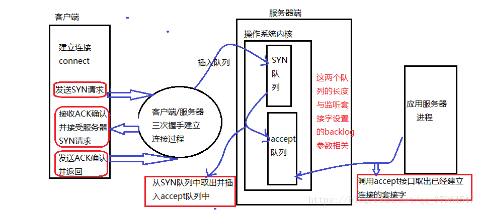 3、客户端调用connect之后,发起SYN请求(一次握手),客户端收到之后会将请求放在SYN队列中,并给客户端回复ACK帧和SYN(二次握手),客户端收到之后返回确认连接的ACK帧给服务器(三次握手),服务器收到之后会将请求从SYN队列中移到accept队列中,这就是三次握手在代码中的体现