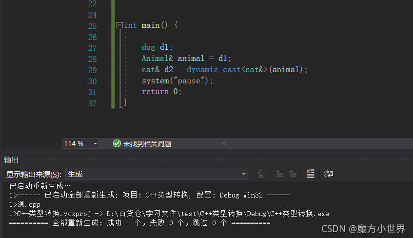 因此,并不是说下行转换不可用,例如上面的将从dog类转过来的animal再转到cat就是不安全的,还是取决于程序员的使用 。
