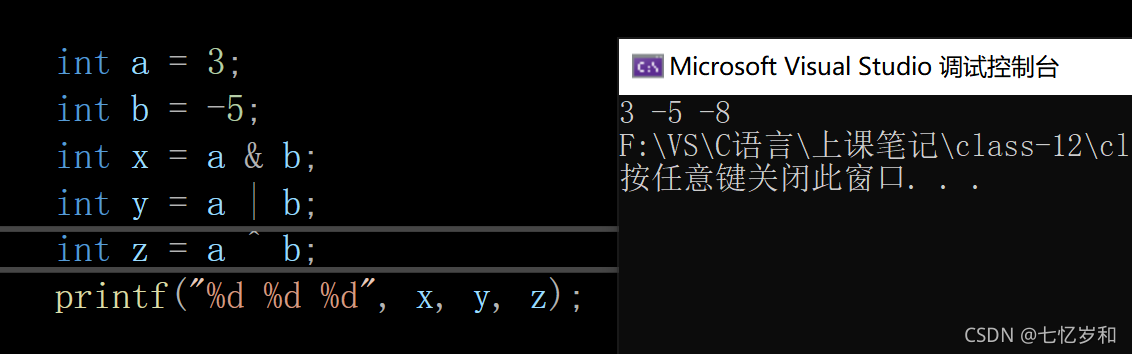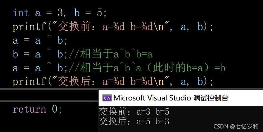 #include<stdio.h> int main() { int a = 3, b = 5; printf("交换前:a=%d b=%d\n", a, b); a = a ^ b; b = a ^ b;//相当于a^b^b=a a = a ^ b;//相当于a^b^a(此时的b=a)=b printf("交换后:a=%d b=%d\n", a, b); return 0; }