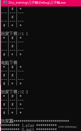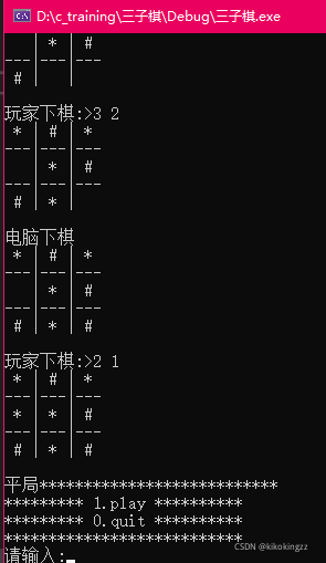 #define _CRT_SECURE_NO_WARNINGS 1 #define ROW 3 //行 #define COL 3 //列 #include<stdio.h> #include<time.h> #include<stdlib.h> void InitBoard(char board[ROW][COL],int row, int col);//初始化棋盘 void DisplayBoard(char board[ROW][COL], int row, int col);//打印棋盘 void player_move(char board[ROW][COL], int row, int col);//玩家下棋 void computer_move(char board[ROW][COL], int row, int col);//电脑下棋 //判断输赢的代码 //玩家赢 ---- '*' //电脑赢 ---- '#' //平局 ---- 'Q' //继续 ---- 'C' char is_win(char board[ROW][COL], int row, int col);//还是要检测棋盘,传入棋盘值