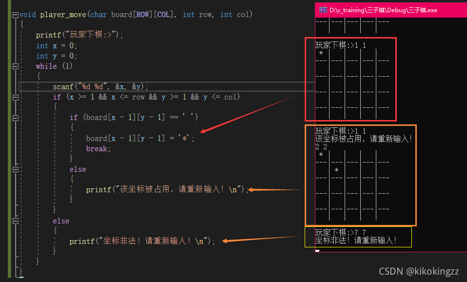 void player_move(char board[ROW][COL], int row, int col) { printf("玩家下棋:>"); int x = 0; int y = 0; while (1) { scanf("%d %d", &x, &y); if (x >= 1 && x <= row && y >= 1 && y <= col) { if (board[x - 1][y - 1] == ' ') { board[x - 1][y - 1] = '*'; break; } else { printf("该坐标被占用,请重新输入!\n"); } } else { printf("坐标非法!请重新输入!\n"); } } }