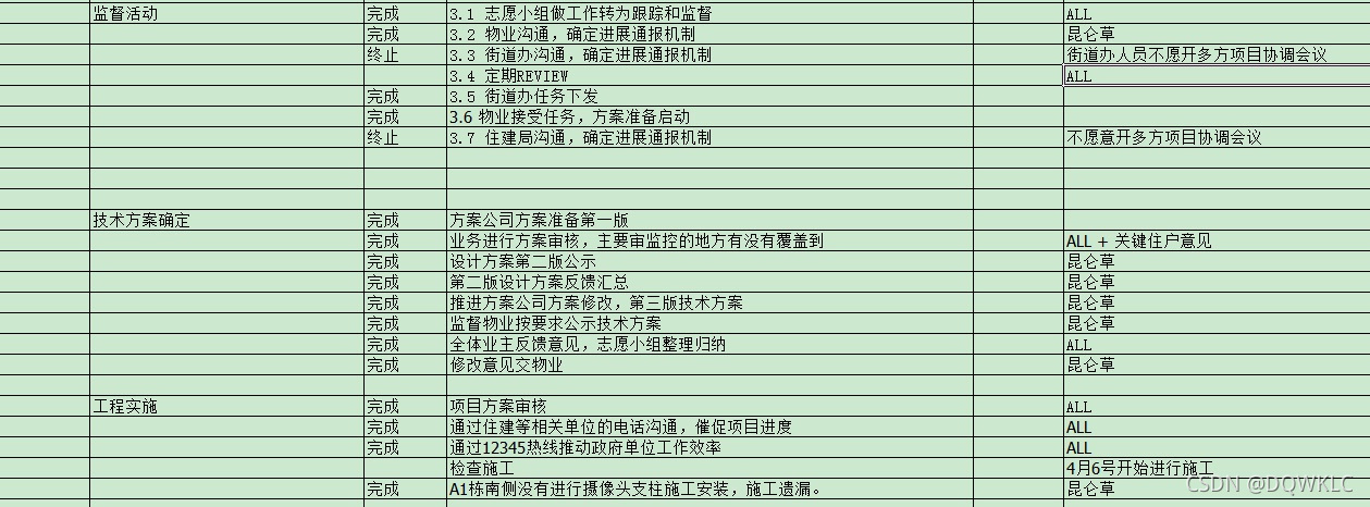 5、项目管理情况:林海山庄防高空抛坠物监控摄像头项目中,志愿者小组采用问题单闭环管理的项目管理方式,对任务进行分解成不同的问题单,每一个问题定有责任人进行跟踪落实,定期进行审视和梳理,确保每个问题闭环管理。由于小组人员都有各自的职业,通过微信进行项目沟通,互相帮助提醒。