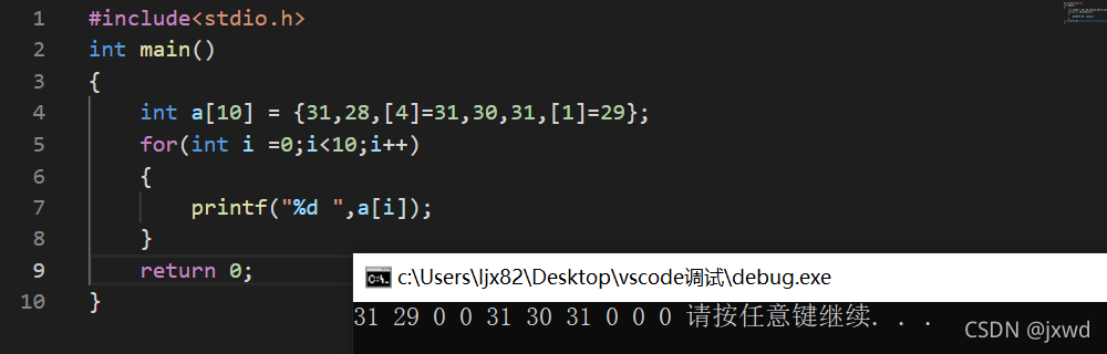 1、 如果初始化容器后面有更多的值,那么这些值将用于初始化指定元素后面的值。以上面的代码为例,[4]=31,30,31,那么第五个元素是31,后面的元素30,31就会默认放在第六个和第七个位置作为a[5]和a[6]的初始化的值。