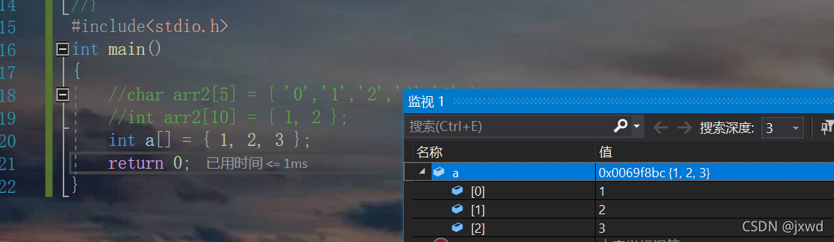 如果我们在[]内未指定元素的个数,那么编译器会自动把数组大小设置为足够装得下初始化的值。
