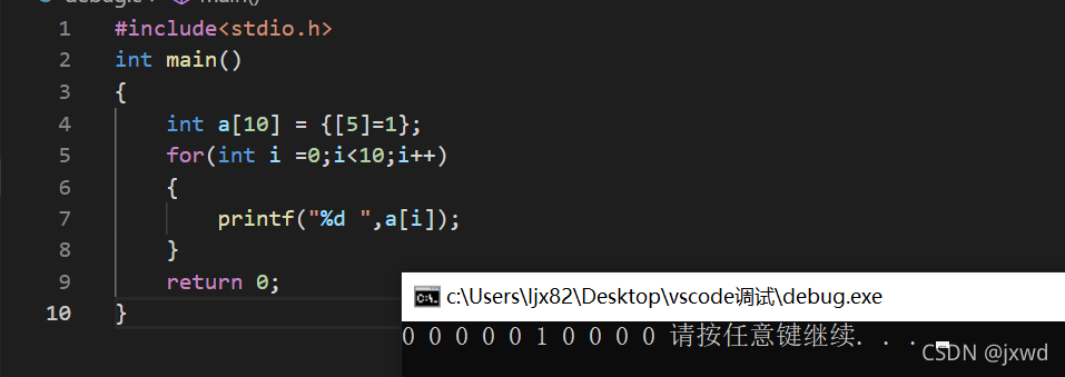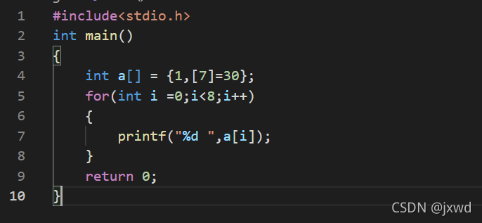 如上图所示,我们将数组a以这种方式初始化,那么它的第六个元素(下标为5)被初始化成了1,而其他的都默认被初始化成了0。
