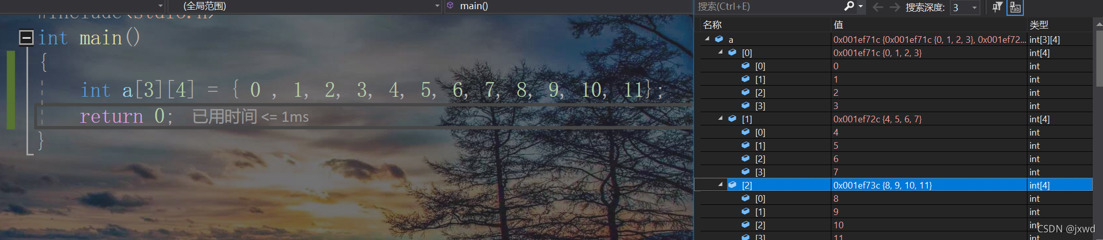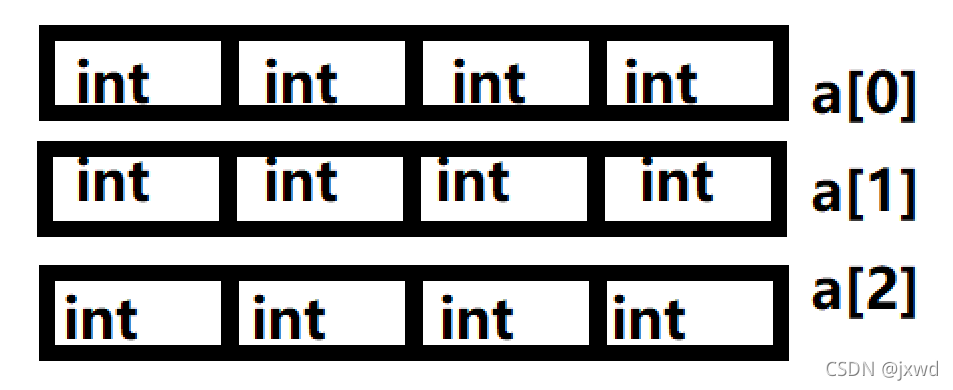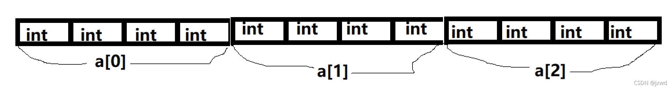 这个a[3][4]数组中,可以拆分为a[0],a[1],a[2]三个一维数组,然后每个一维数组中有4个int类型的元素