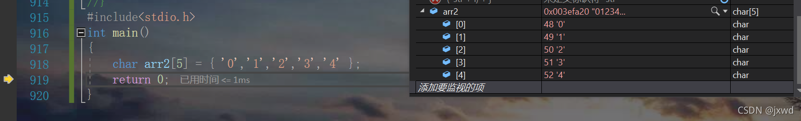 如图所示,我们成功的在arr2的数组里面创建了5个char类型的元素。
