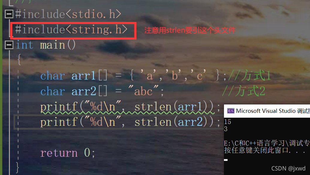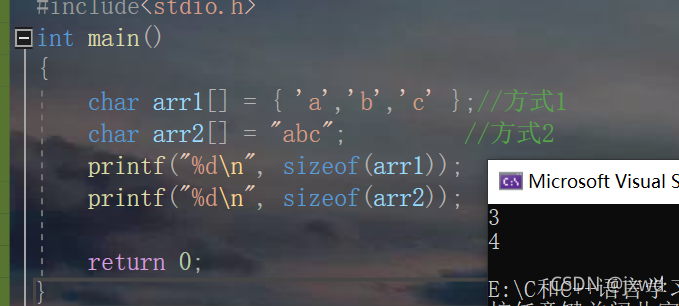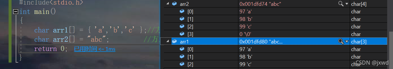 我们可以清楚的看到,arr2里是有4个元素,即字符a,b,c和\0;而在arr1中只有3个元素。