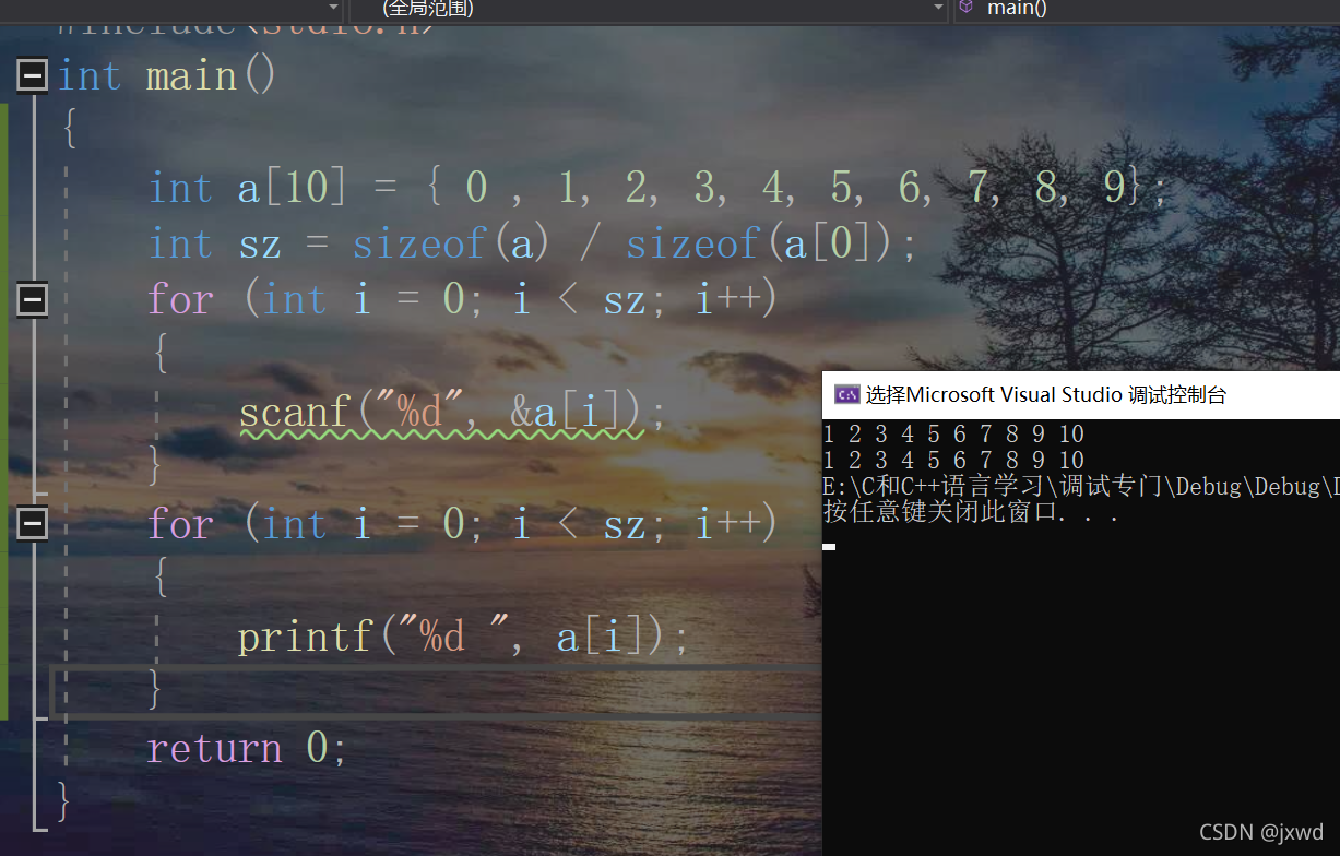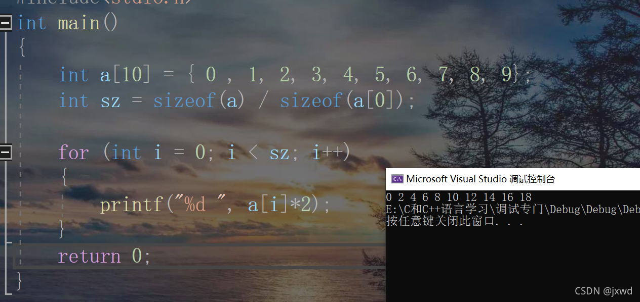 我们先把 数组的中元素的个数计算了出来(方法是用数组的大小除以数组每个元素的大小),然后再以for循环的方式将其一一打印了出来。