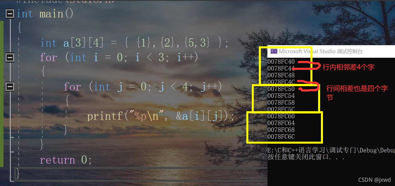 我们需要知道这样一个事情:数组在内存中的存储是连续的。而一个字节给一个地址编号。