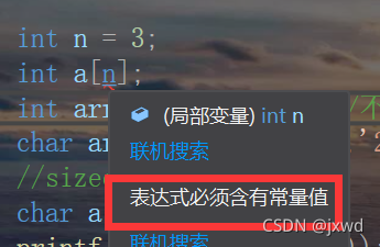 由上图可知,在vs2019中,会报错,而且报错的理由就是表达式必须要含有常量值。哪怕你是const修饰的变量。(下面我们会讲到:const修饰的变量具有常变量属性)