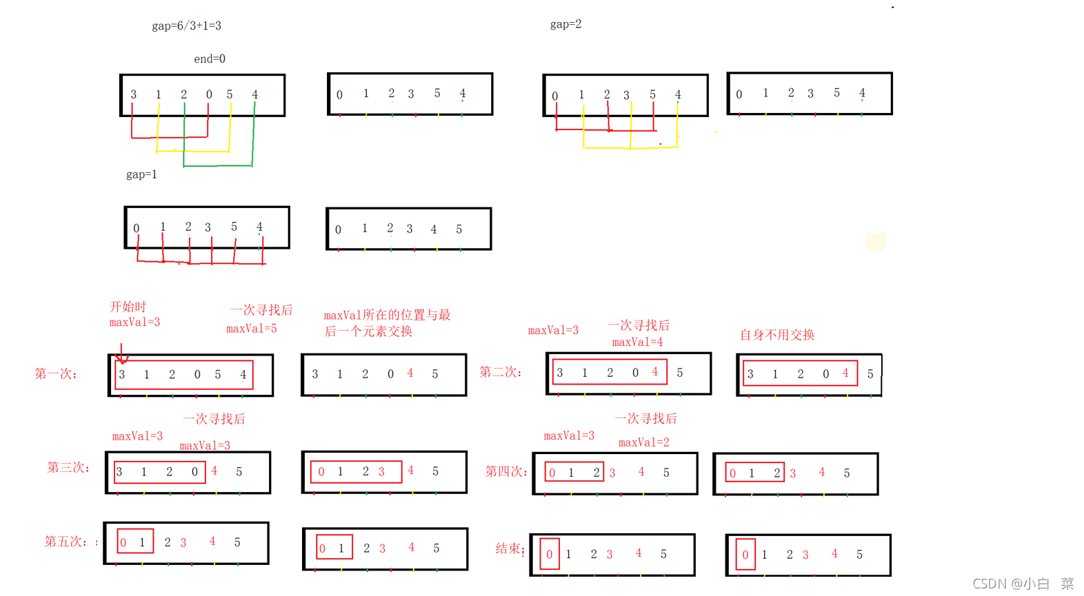 每次选择一个最大的数放在数组的末尾(或者每次选择一个最下的放在数组头,起始位置后移),然后数组长度-1,接着使用该方法,直到所有的元素排序完成即可。