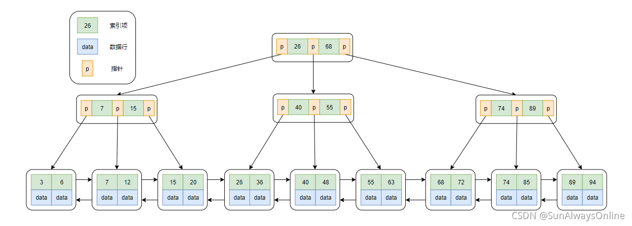 - 每个节点可能存储多个元素,节点内元素是有序的,每一个元素也会对应一份数据行(当然也有可能是主键索引项,或者数据行的地址)。