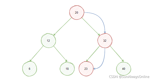 例如查找元素23时,先从根节点开始,因为23>20,路由到右子节点32上。因为23<32,路由到其左子节点23上,发现相等,查询结束。