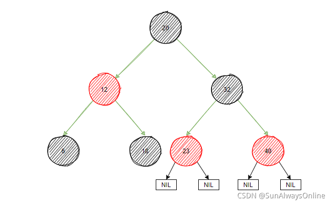 在红黑树中,节点要么是红色,要么是黑色。根节点与叶子节点(NIL)都是黑色的,任意一个路径不能连续出现2个红色节点。从根节点出发的所有路径,黑色节点(不包含NIL)的数量都是相同的。